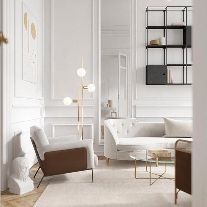 Un look art déco pour décorer avec du caractère votre salon. Un lampadaire au style art déco dessiné par la marque Hubsch entièrement en métal doré, composé de 3 diffuseurs en verre blanc.