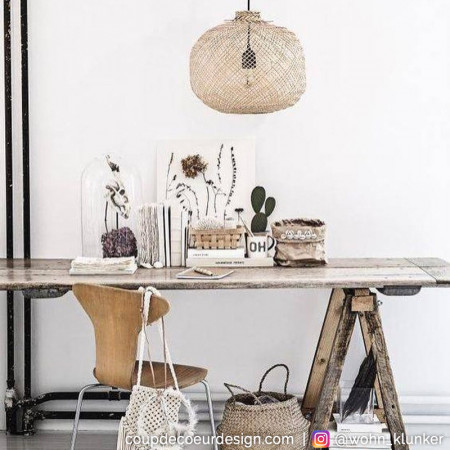 Certes, le lustre en bambou tressé naturel LARGE BAMBOU apporte une petite touche « ethnique-chic » à un salon ou une salle à manger, mais son style reconnaissable fait également des merveilles dans une chambre à coucher, une cuisine ou même une salle de bains. Quelle que soit la pièce de destination de ce lustre en fibres de bambou tressées, n’oubliez pas de l’associer à des touches végétales pour un effet nature relaxant. Ces touches de verdure peuvent prendre la forme de petites plantes en pot comme de motifs végétaux sur les murs.