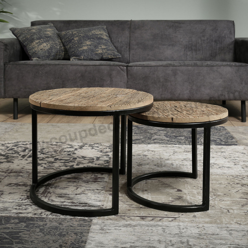 Ce meuble de salon se compose de deux petites tables rondes qui s’emboîtent parfaitement selon vos préférences de disposition. Le plus petit modèle (40 cm de largeur, 40 cm de profondeur et 35 cm de hauteur) se glisse habilement sous le plus grand (50 cm de largeur, 50 cm de profondeur et 40 cm de hauteur). Si vous le souhaitez, vous pouvez même installer chaque petite table ronde en bois et métal à des endroits différents dans la pièce.